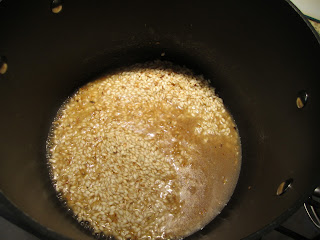 4. Bring your rice and broth to a low boil. Stir well. Let it simmer until all the liquid has been absorbed and then add another cup of broth. Continue adding broth 1 cup at a time until all the liquid has been absorbed.