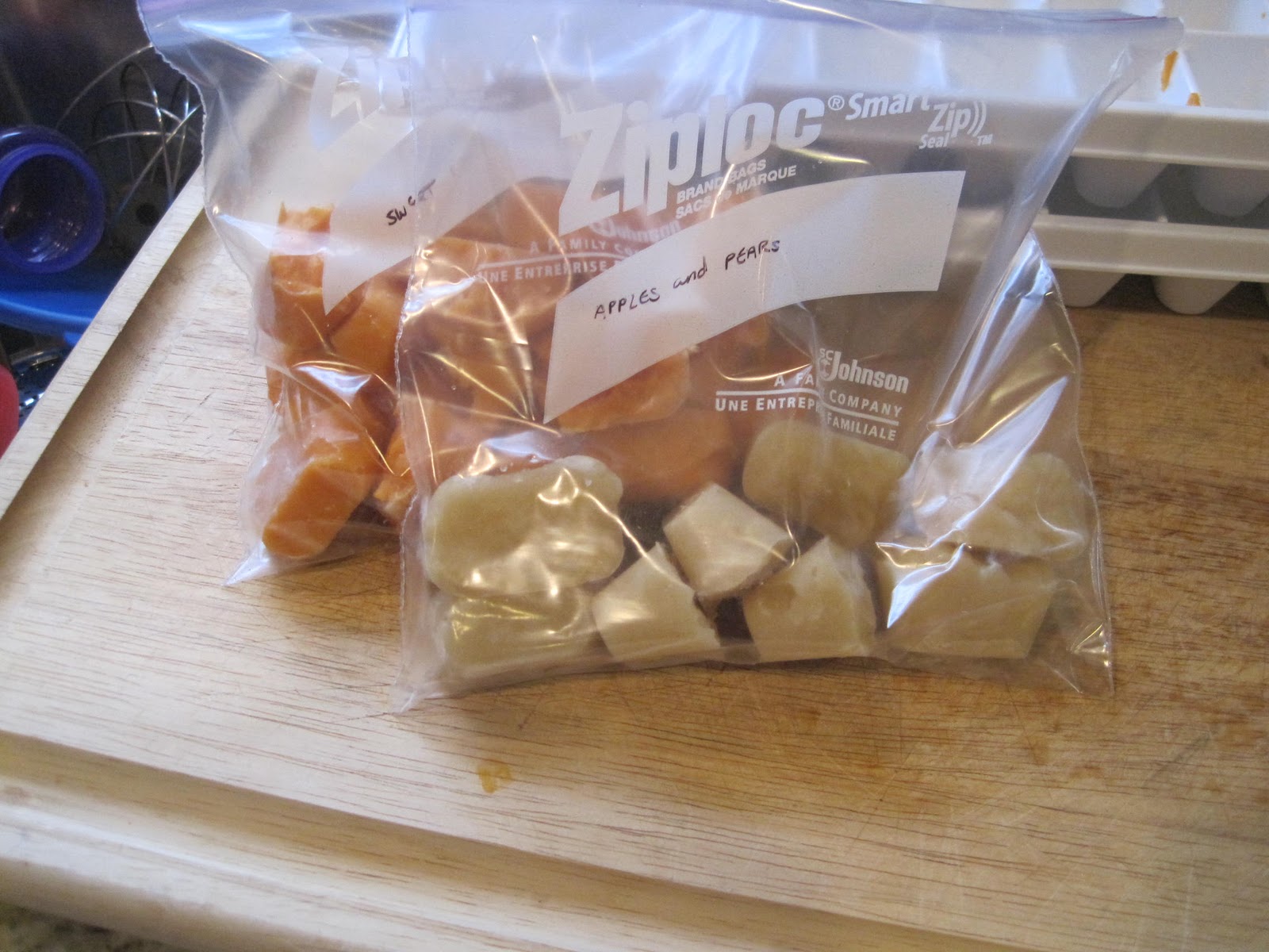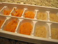 After you steam your veggies and fruits until they are easily mashed, you can use an ice cube tray to make baby-sized portions ready for instant access. Freeze small portions in an ice cube tray and then pop them out after a few hours. Store your veggie cubes in freezer bags labeled with the ingredients and the date. Thaw one or two at a time as needed. After I thaw out a cube or two, I like to thin it out with a little water or breast milk before I feed it to the babe. Delicious, easy, healthy. Who needs jarred baby food when home made (local!) food is this simple?