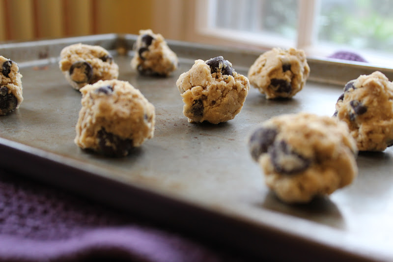 5. Using a small ice cream scoop or large tablespoon, scoop out dough and place evenly on a cookie sheet.