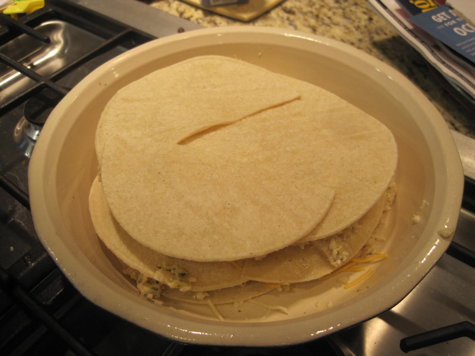 Layer 1 whole tortilla and 1 tortilla cut in halves so it covers the bottom of the pie pan (spray first with cooking spray). I find that cooking shears are a handy tool for cutting tortillas.