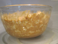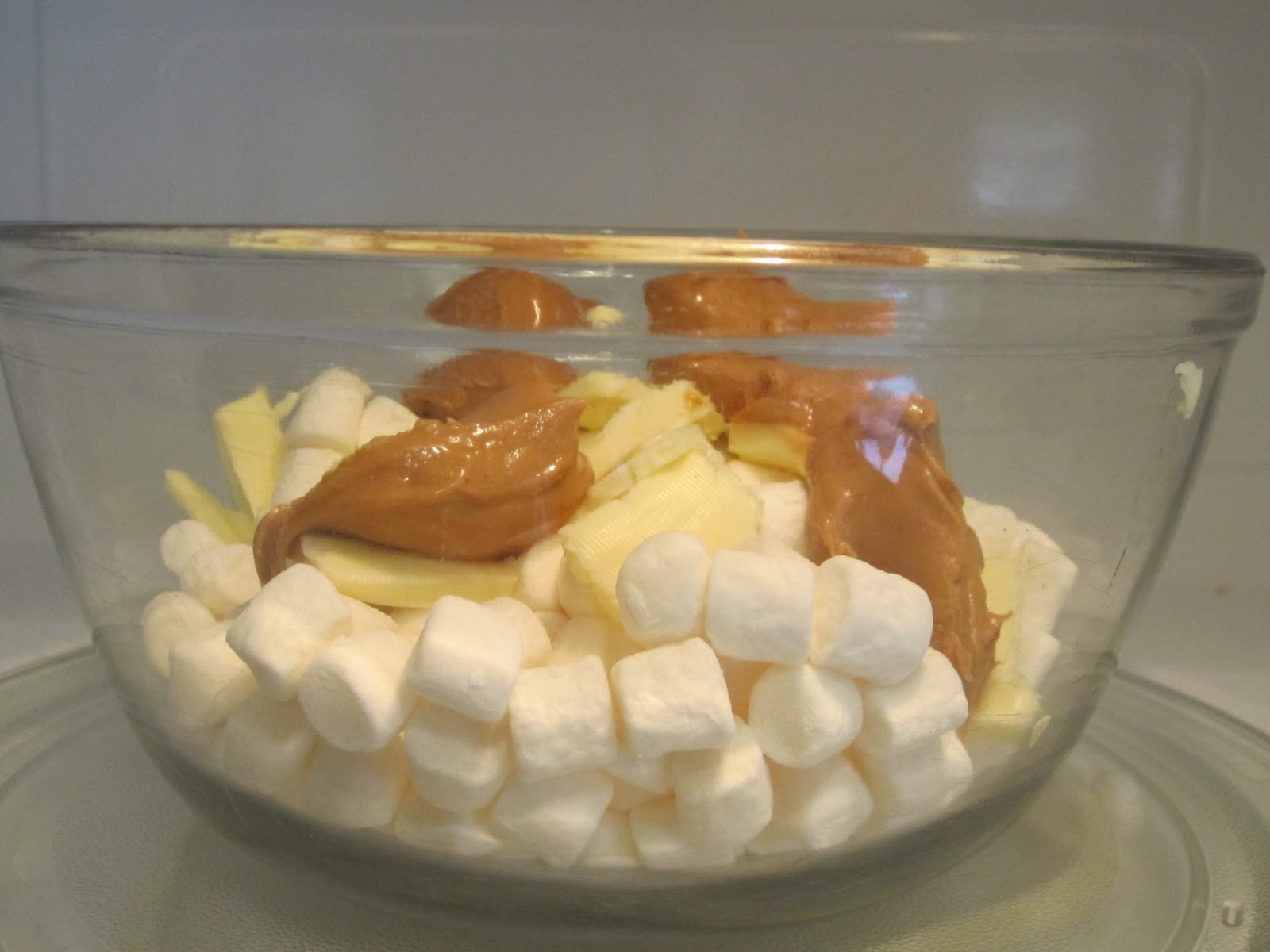 I combined 4 cups of mini marshmallows, 3 tablespoons of butter, and 1/4 cup (or so) of peanut butter and put it on high for 2 minutes.