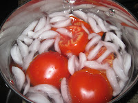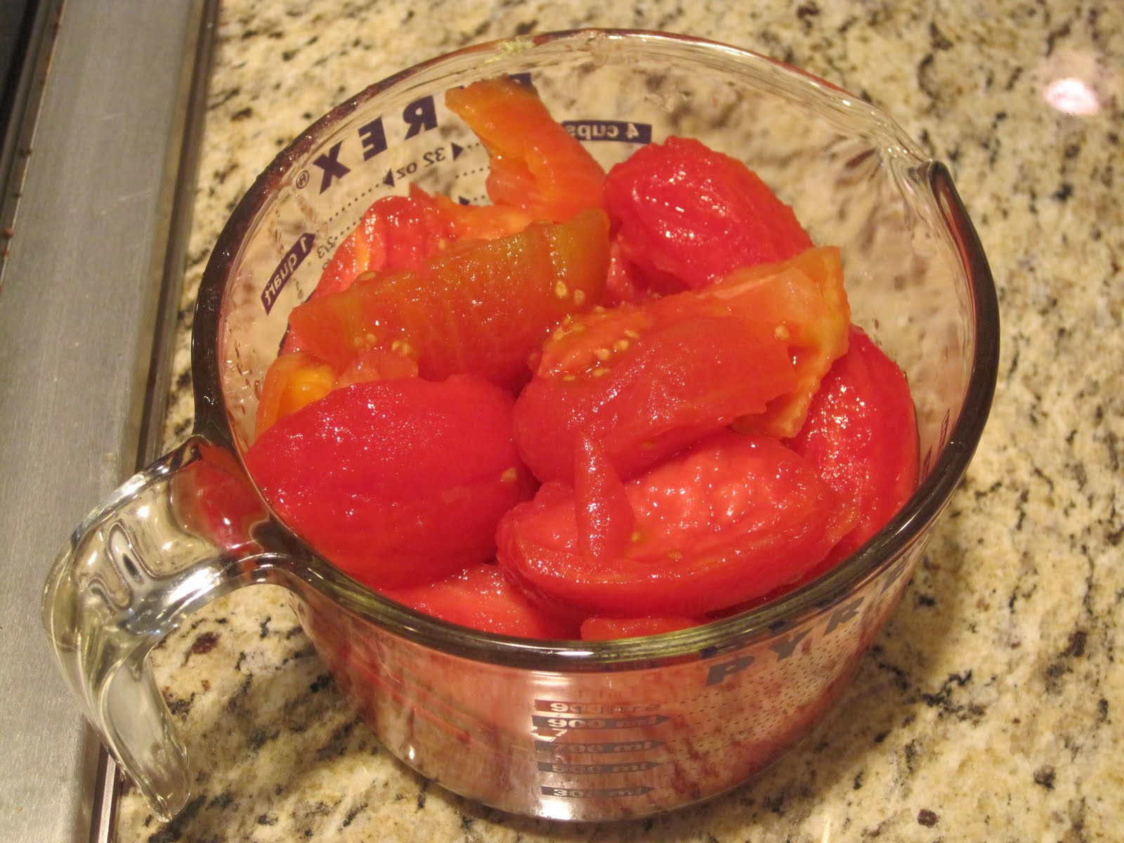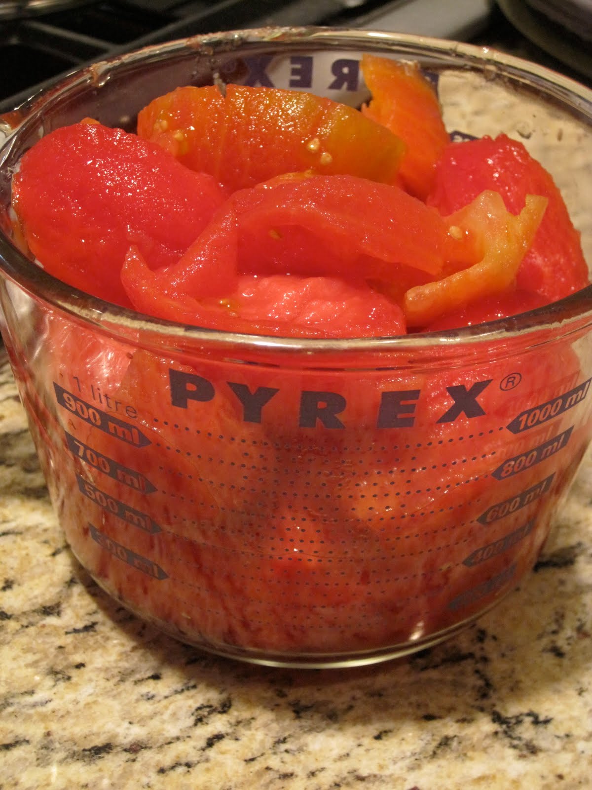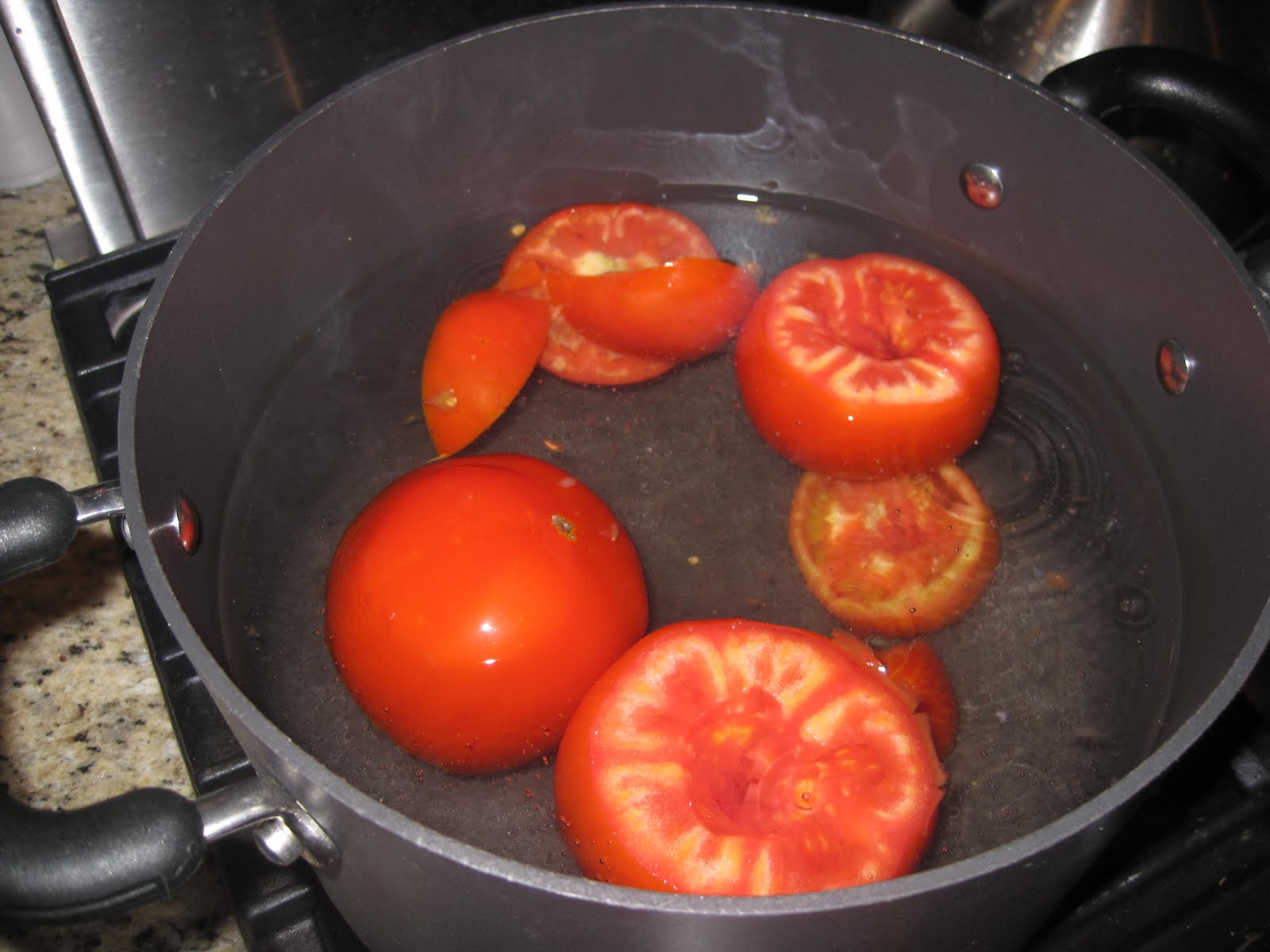 Supposedly plum tomatoes (or roma tomatoes) make the best sauce, but I use whatever I have around. My last batch of tomato sauce was simply a collection of tomatoes too ugly to be served in public. To get the tomatoes ready to be simmered down to a tasty sauce, you first have to peel and seed them.