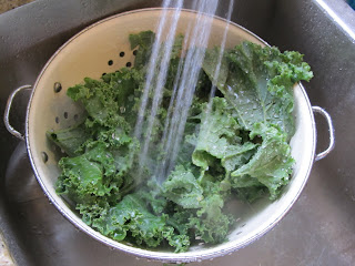 Rinse the kale very well and remove the leaves from the tough stalks if you haven’t done that already. I like to prepare my entire bunch of kale the first time I use it so that it is at the ready to toss into future recipes in short order. I store my kale leaves in a large ziploc bag and it seems to last in the fridge for about 2 weeks.