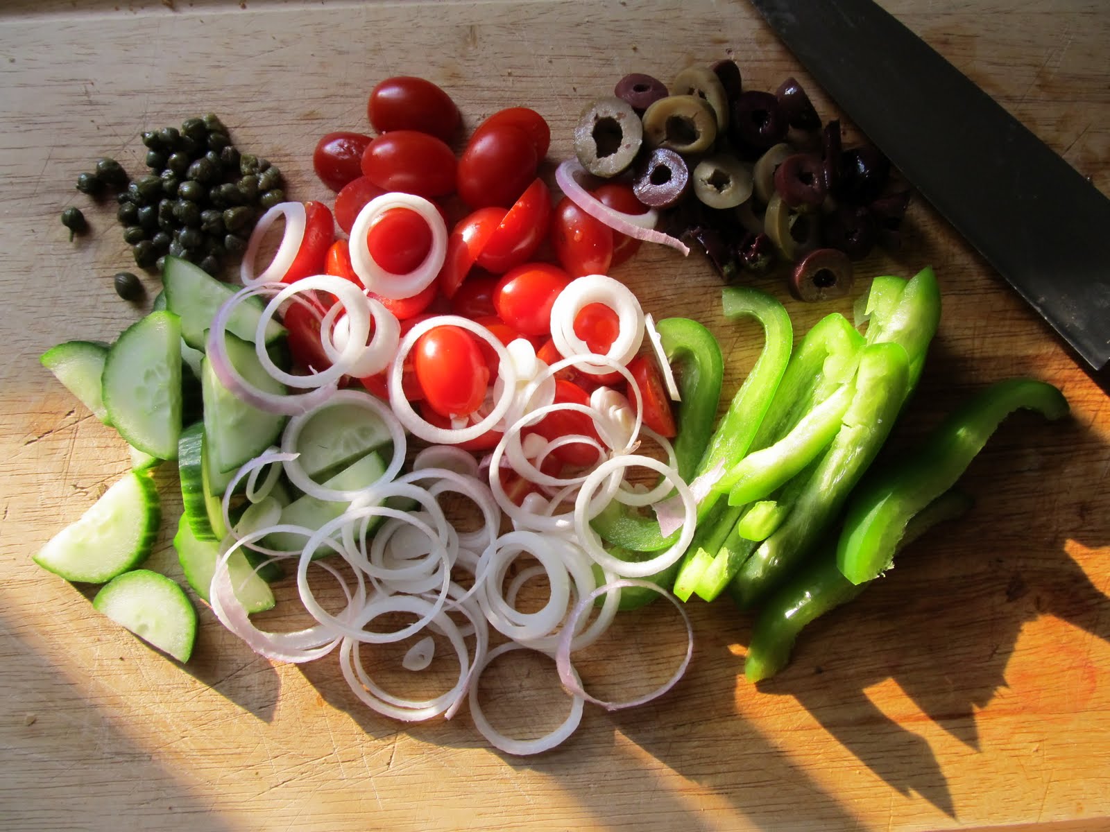 5. Toss the vegetables, the basil, and the capers with the bread that has been absorbing all the flavors of the dressing.