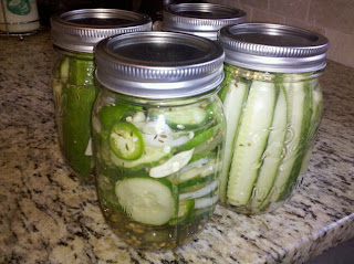 2. I used four 8 oz. mason jars for my 8 (or so) cucumbers (about 3 to 4 inches long). Cut the ends off the cucumbers. Slice the cucumbers (whichever way you prefer) and place them in the jars while your pickling liquid is coming to a boil. I also added sliced onion, garlic, and jalapeno peppers from my garden to some of the jars to add a little zing! I added about 1/2 teaspoon of mustard seed and dill seed to each jar.