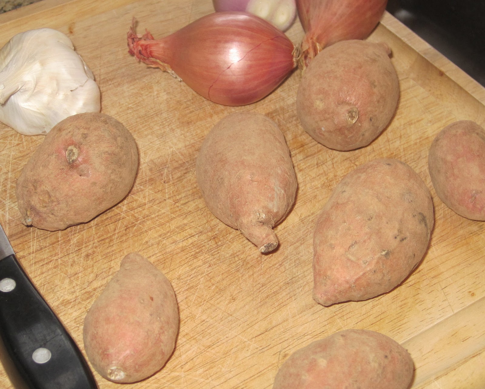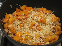 Saute shallots and garlic in olive oil and butter. Add the sweet potatoes – cook for a few minutes over medium heat. Add the rice. Add broth, 1 cup at a time, stir well to incorporate, keep the heat at about medium.